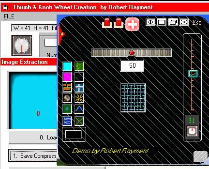 Knob-Thumb-wheels & Skins Demo by Robert Rayment. An earlier version has been deleted. Three programs. The first develops and tests bmp strips from a starting image where, for knob wheels the central rotating part's radius and incremental angle can be set as well as, for thumb wheels, number of repeated images. The second program makes compressed True Color 2D arrays of images and masks using zlib.dll (version 1.1.4.0 from www.winimage.com/zlibdll/). For most efficient inflating zlib needs the original uncompressed size. For pictures the original width and height are needed and this is stored at the beginning of the compressed picture array, from which the uncompressed size can also be calculated. The third program uses zlib.dll to inflate the images from a resource file. This is a headerless form, skin, controls & fonts resizing demo using some standard methods (plus some WAV sounds also in the resource file) - a test bed for trying out things. There are 2 full skins but the demo also stores some bitmaps in image boxes, which then serve as buttons and source for tiled skinning. When compiled all the images are then contained within the exe. See Notes.txt. (exe tested on WinXP Home) Win98 Zip 76 KB.