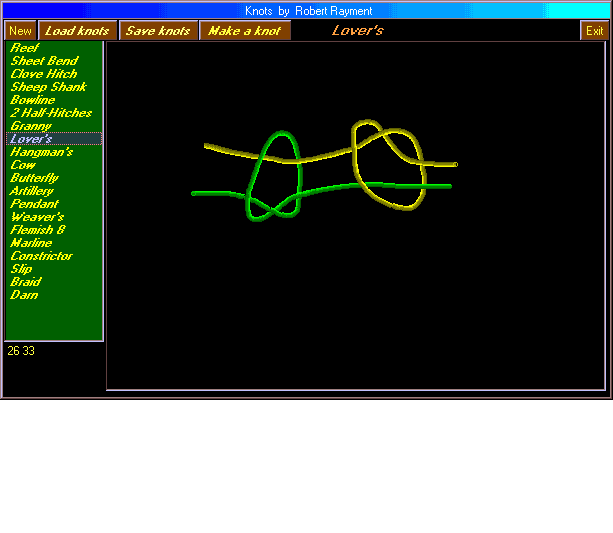 Knots by Robert Rayment. Load knots, Save knots (*.knt files), Make a knot (colored cursor, + hairs, grid). Examples KNOTS.knt (20 knots drawn using this prog) & Hello.knt included. See also KnotsInfo.txt. Zip 21KB, Win98.
