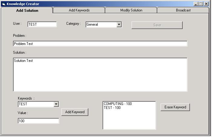 This program will help you create your solutions for your users to use. Simply insert all the information about the problem and the solution then pick Keywords and add them to the solution with a value. the trick is the more words you put the more chances there is that your solution will come up first on the list if the user inputs them all. they are sorted by value so you can put important solutions on top.