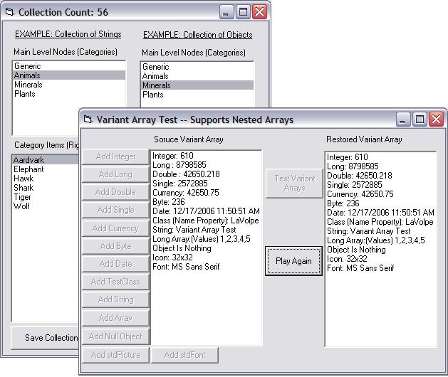 Updated: See end of description for change... A hybrid collection class that kind of combines a TreeView collection (nodes and heirarchy) and the standard VB collection object. Supports arrays, objects & classes. The project exposes over 30 methods/properties to assist in managing the collection. It even has the ability of persisting the collection. Please play and offer suggestions and report bugs. Don't forget to review the RTF document included. 7Dec06::Added SortCollection & IndexFromKeyIndex routines. AddItem,MoveItem now allow sorting too. 14Dec06: Overhauled array serialization. Now supports all arrays, even supports nested variant arrays. Only user intervention would be serialization of your objects, if applicable. Added another test form to test Variant Arrays. 15Dec06::Reference counts on deserialized objects were not always correct. Fixed. 17Dec06: Added support to save stdPic/stdFont objects too. Final version, barring bugs/enhancements.