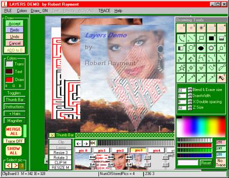 Layers Demo by Robert Rayment. (Update5 fileops correction) This started as a layers demo but grew a bit to include some effects and drawing tools. Individual pictures can be resized, clipped, lassoed, rotated have effects and drawn on and a merged picture can also have all these apart from lassoing and rotating. The transparency can be varied for each picture apart from the background...etc. Too many things to describe them all here so please read the Help. The screenshot was made with this prog but PSPro used to convert to jpeg. Difficult to be sure all bugs removed so comments welcome. (exe tested on WinXP) Win98, Zip 182 KB including some test pictures.