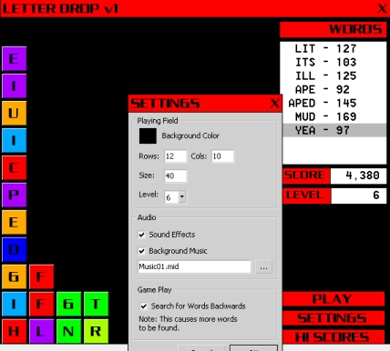 Letter Drop is a game where letters drop (duh ;) and you must (or else...) arrange them to create words. The words can be formed horizontally, vertically, or diagonally. You can also muck around with some settings. (Cool font included.)