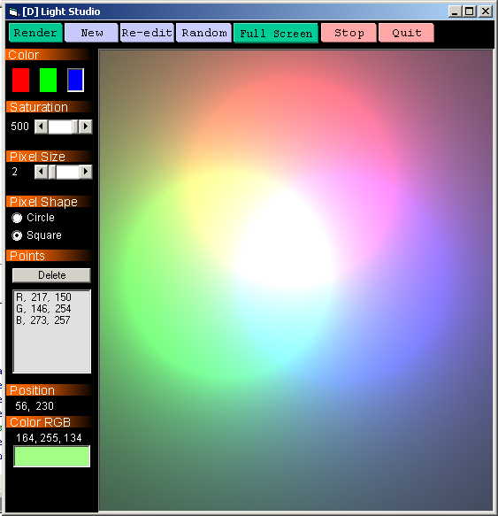 The result.. A program which can produce very interesting colorful outputs by just randomly placing light sources. Moreover, once rendered, the program gives you the RGB component of any pixel present in the output. Thus you like a color, take the RGB value to any other program and reproduce it :)