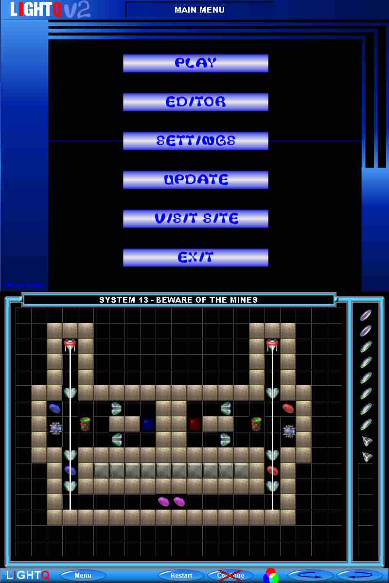 LightQ is a game of mirrors, light and IQ ! it's a logic puzzle game that will proof your knowledge of merging light and reflections. The goal is to get all coins spin by sending a beam of light of the same color over it. This is a COMPLETE game with menu, sounds, music, intro, players, levelpack, editor (for making your own puzzles) and more ! you need the DirectX 8.0 type library (for sound). Further this code is based on the windows GDI32 DLL. In future i will convert it to pure directx for more platform support. Please let me know incorrect code behaviour. For now check it and have a lot of fun playing this game!!!