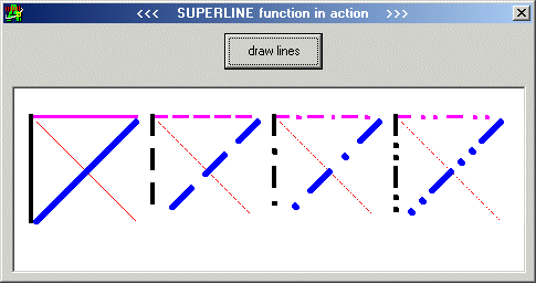 See Line method for Form or Picture. SUPERLINE is just the same, BUT thick lines can be drawn with dashes and dots (Line method can't).