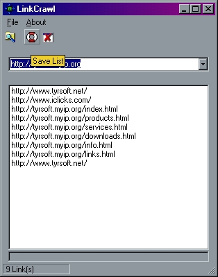 Link Crawl will search the webpage that you enter in the combo box for links and place them in the list box...you can then save the links to a file for later viewing..vote and visit my website!!!