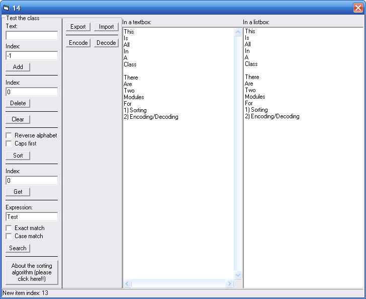 I often find myself in need of a listbox in applications in which I don't use forms. I couldn't find anything on VBC (which would have saved me some time), so I just wrote my own. This is just a simple listbox class, no events, no confusing, never ending functions, just plain, simple VB code (I haven't used any APIs :D). The class is very small (only 2.3 kb). Also, this class can have more than 32767 items, because I've used Longs, and not Integers (like the VB listbox).