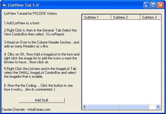This is a example/Tuturial on how to use the Listview....This will show you how to add text, Subitems, and icons to your listview. I made this simple prog for a friend and he told me to upload it on VBCode.com dont worry about voting for this code unless u feel that it is nesscary. Carsten D. - www.intradream.com