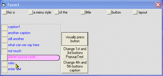 LittleButton.ocx is a one of a kind button that is actually many buttons in one. Instantly creates and array of buttons(up to 20 elements). The buttons can be arranged vertically or horizontally (menu style) Just about every visual aspect of the control is totally customizable from the caption style(flat, embossed, shadow, raised) to the mouse over hilite color, and more than 2 dozen additional properties. One look at the screensh0t will convince you of just how much time and work was put into this.