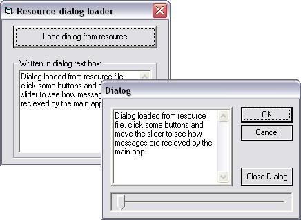 This code load's a dialog from a resouce file, it can also manipulate the controls on the dialog and recieve messages from it using subclassing. There is included one resource file containing a dialog with various controls, also one commoncontrol (slider) and some non-standard buttons.