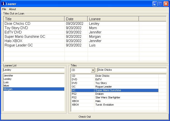 To check out a title to a Loaner, select the Loaner, select the Title, and click Check Out. They get added to the LoanList Table along with the Date they checked it out. This can be totally customized to fit your needs, this is my first submission to vbcoders in my 2+ years of VB6.