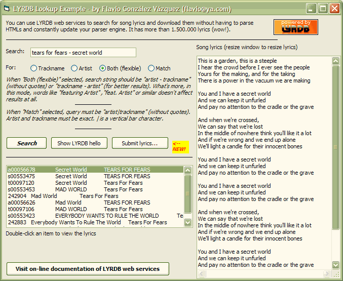 Lyrdb Lookup is a sample project using clsLyrdb, a VB6 class encapsulating all LYRDB functionality to retrieve lyrics automatically without having to parse full HTML pages of content. I've recently created LYRDB.com, a different lyrics portal: it has over 1.500.000 lyrics (wow!) and it offers free web services to access this huge resource of lyrics programatically.
