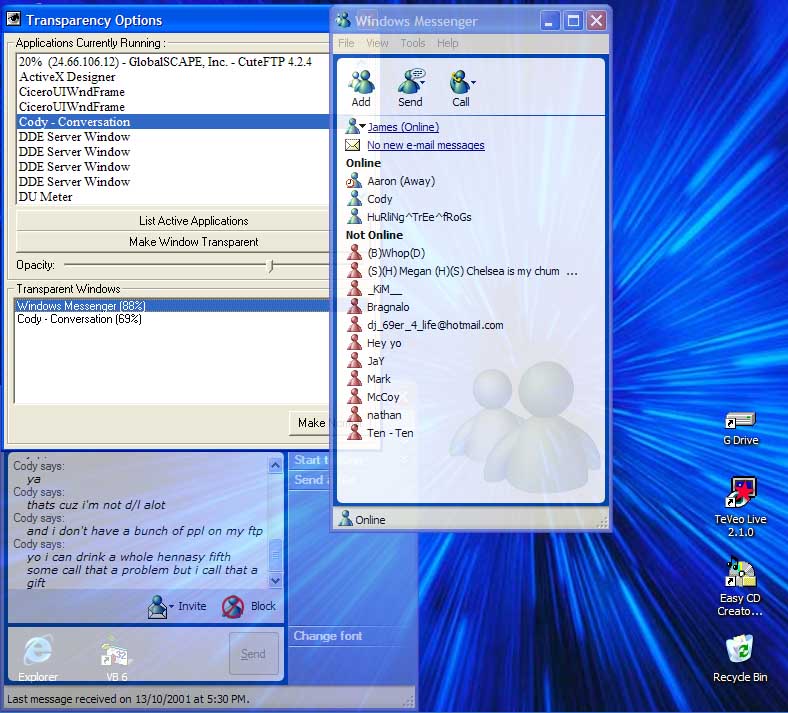Use this code to change any program on your computer into a semi-transparent look... (Only with windows NT, 2000 or XP) Don't forget to VOTE and leave a COMMENT!