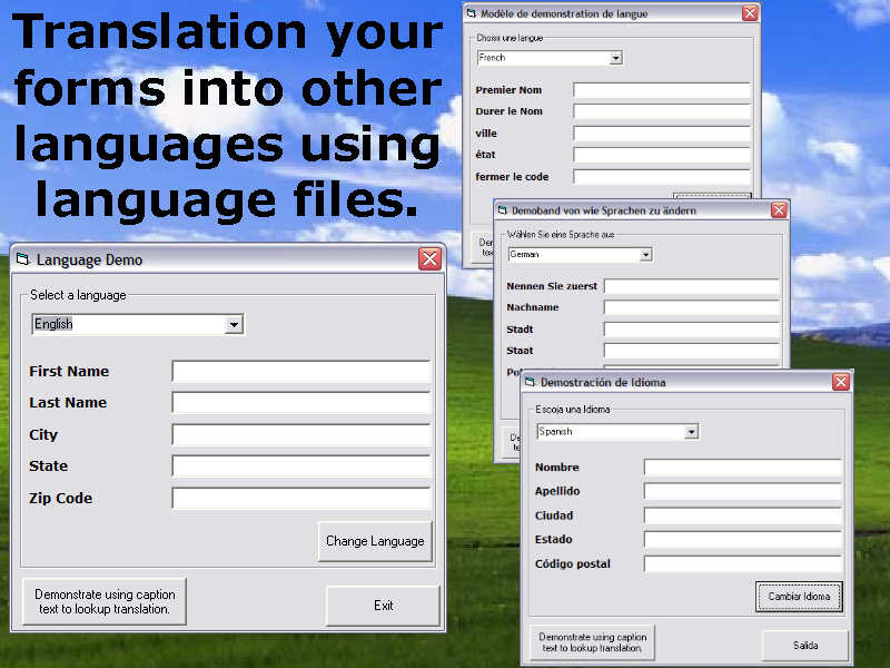 A class and a demonstration to allow your application to use language files. Allows you to create language.lng files for any language and change all text within the application to the new language.