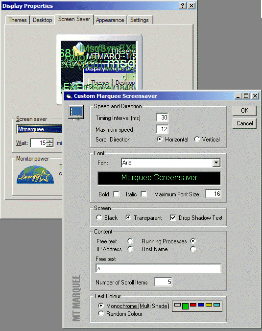 The marquee screensaver is superb... but it doesn't do enough!! This version will display free format text like before, but also other things, like your machine name, ip address (no ocx!) or all your running tasks. Screens are good enough these days not to really require a comprehensively blanking screensaver, so I've added a transparent option too. There's lots of code here, all functionalised: Get IP address, Hostname, running processes, shrink screen to fit in Display properties window and bitblt of course. It seems a little cheaty, but I've allowed you to set the timer interval and maximum objects speed to tune to your own system. votes and comments always welcome. :-)