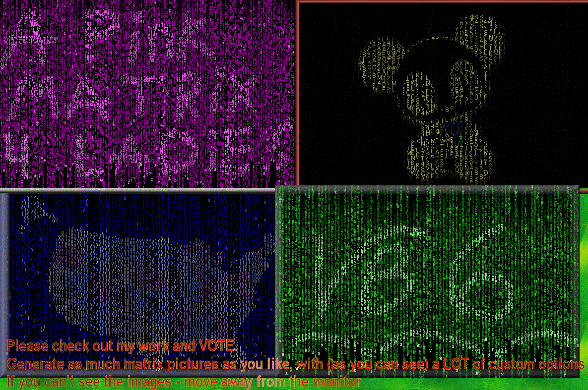 The programm generates "matrix" lines - with user's settings. Then blends the "matrix" with another image in a special way so the image is only blended on the letters. See SCREENSHOT.NO API.Creates Cool effect! Has a lot more features like: Drawing by yourself, choosing transparent color, cusomizing matrix(line length, font, num of lines etc.),select RGB channales to adjust image and more.. please vote