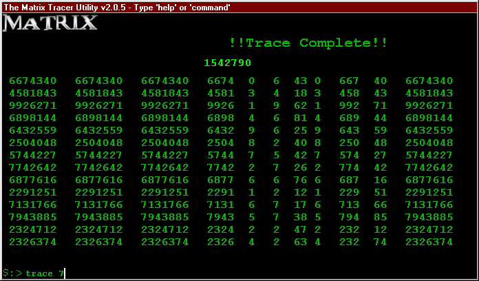 This is a re-done version of Nick Romanelli's Matrix Tracer code(https://VBCode.com/xq/ASP/txtCodeId.21214/lngWId.1/qx/vb/scripts/ShowCode.htm).