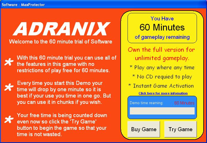 With MaxProtector you can give your users 60 minutes to try out your program (rather than 10 uses or 30 days) it includes many features along with a nice and bright layout/design, to register the software the user must have a unique registration code for their computer also if they enter the registration code in incorrectly they must also enter a PUK code to unblock it (which they must get off you) and then if they get it wrong a further 5 times after that the software will permanently disable its self (to unblock it after that you must go into the registry). MaxProtector will only allow one copy of its self to be open at any one time.