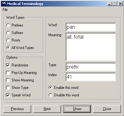The words, or terms, which make up the language of medicine are referred to as the terminology of the medical field, or Medical Terminology. This app is a sort-of quizzer that reads aloud (using text-to-speech) to the user over 500 words from a supplied Access database. The user has the option to manually or automatically show the meanings of the words.