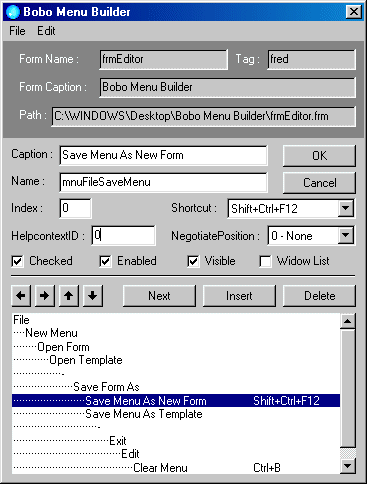 This little App will allow you to edit or create menus in VB6 Forms. It removes the limitations of the number of nested submenus allowable in the VB6 menu editor on which it is based. New forms can be created with menus in place. It can be used to extract menu structures from one form and place it in another. You can save menu structures as templates for later use. It has only been tested in VB6. Use it as you would the Menu Editor in VB6 with the exception of the Open/Save operations. As with all my submissions, bugs and errors are provided completely free of charge.