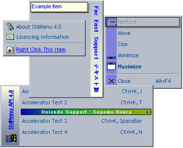 Version Upgrades: 4.1 (07/01/2001), 4.0 (06/18/01), 3.0 (02/22/2001) and 2.3 (10/28/2000): New Features include: Each item may have its own Font, right-justification of menu items, and support for menu breaks and menu bar-breaks. In Version 4.0, the object model was completely revamped and simplified, developer documentation is now included, and a number of new features, such as support for background gradients, multi-line menu items, and Unicode, were added. Version 4.1 adds Office XP style flat menus.