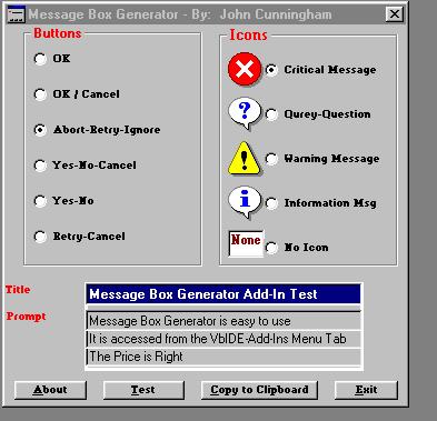 file to install. Once installed the Message Box Generator is availabel through the VB6.0 IDE. Go to the IDE's Menu Bar, select Add-Ins, select Add-In Manager, select Message Box Generator and check