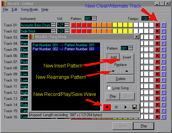This is an unofficial update to the award winning drum synthetizer MicroKit from Stuart Pennington. I added support to save the songs in Wave format, which can be later converted to MP3. Also added more editing features, like: clear track, alternate track, insert and rearrange patterns in song mode. You may include your own voice while saving to wave if your microphone is turned on.