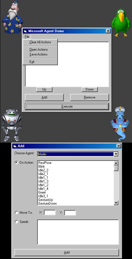 This program is a demo that allows you to command the different Microsoft Agents to do certain things. You must have Microsoft Agent to use this. You can download it at https://msdn.microsoft.com/msagent. Upon request, I have added the ability to move actions up and down, as well as save and open commands.