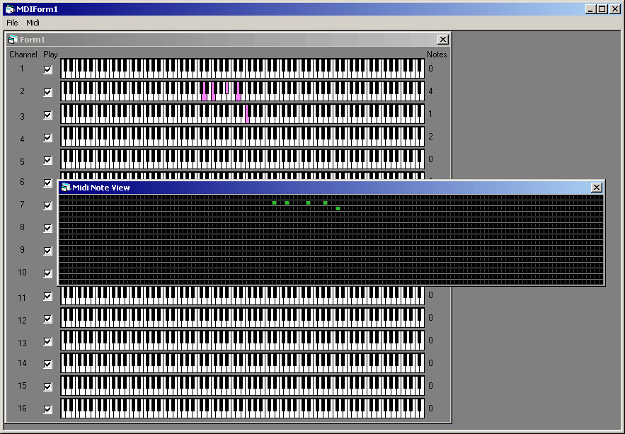 MidiWorkShop loads and plays a midi file, displays playing notes both in a piano roll and a grid view at the same time. Midi file is loaded fully (all events including meta and SYS-EX) into an OO hierarchy, but SYS-EX messages is not sent in this version to the midi device.