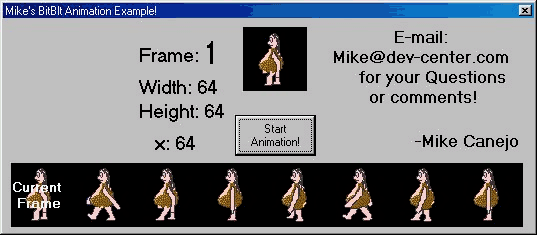 This is an great example of how to use BitBlt to make a simple Animation either for a game or for a application. Every line commented in this and I tell you exactly what's going on. So check it out, the Screen Shot pretty much Explains it all...