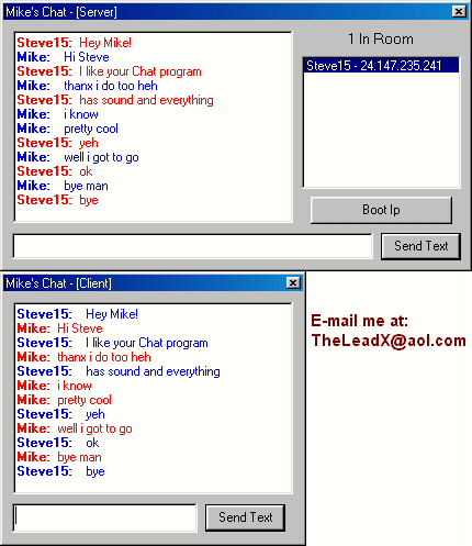 This is a basic Server/Client Chat made using Winsock and the UDB Protocal. The chat is in Rich Text so it looks just like an AOL chat and it also has Sounds when chatting. If the Client/Server closes the program, the other side gets an error saying so. This is so you don't talk to your self..heh All the client's Nicknames get logged into a ListBox and if they leave the room, their name gets removed from the chat listbox. I also included a "Boot Ip" for the server so he/she can boot someone in the chat that is acting up. Check this example out and RATE it! :P