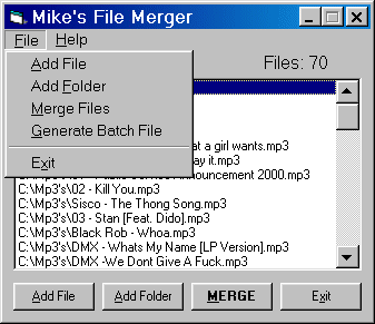 This will let you merge any type of file(s) into one big file. This will work with Almost all audio files (.mp3, .wav) and almost all Video files (.Avi, .Mpeg). Just think, merging all your favorite mp3s into one big file so you don't have to keep making playlists on your audio player and just think if you have a split up DiVX movie and want to put all of the parts together, this will do it. This will also merge .VOB files ripped from your DVD!