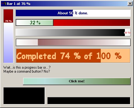 This is the coolest Progress Bar control you have seen out there. Includes many nice features. Can do colorfading, text scrolling, borderstyles, can be set vertical...anything you can think of. Besides that, the code is very efficient and fast. A good example on how an ActiveX / OCX is made and what it needs.