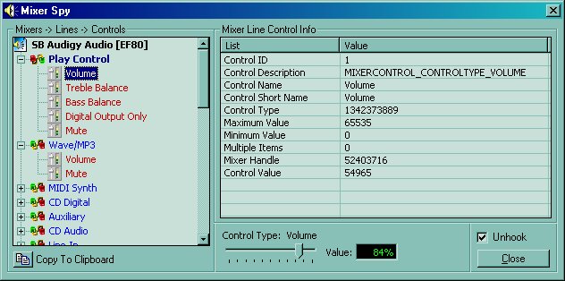 Subclassing! This code subclasses SETFOCUS msgs for sound controls (volume, mute, etc) and also subclasses the window for mixer control change messages. You can enable hooking by using the checkbox provided but make sure you disable the hooks before setting breakpoints or hitting the end button. If not, you will freeze the IDE and lose any changes you have made.