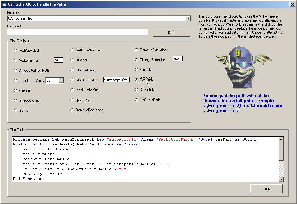 Handling File Paths. The VB programmer should try to use the API wherever possible. It is usually faster and more memory efficient than most VB methods. We should also make use of .RES files rather than hard coding to reduce the amount of memory consumed by our applications. This little demo attempts to illustrate these concepts in the simplest possible way.