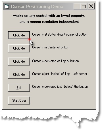 Positions the Mousecursor over a control. Similar to other routine(s) which move the cursor to the control with the Focus. However, this method is much simpler and is resolution independent, so it doesn't need tweaking at different resolutions.