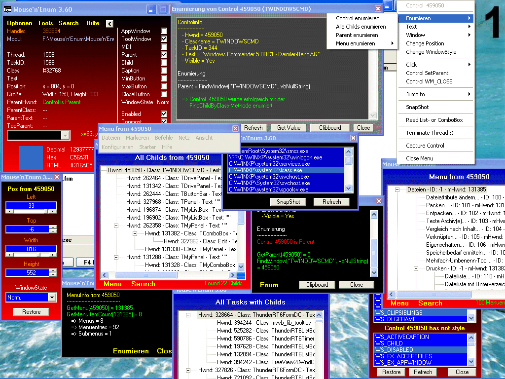 Mit dem Menueintrag ‚Change Position’ kann ein Control beliebig in seiner Größe verändert erden. Unter ‚Change WindowStyle’ können sämtliche SW_STYLES verändert werden (ein Restore-Button macht geänderte Styles wieder rückgängig. Unter dem ‚Clickuntermenu’ befindet sich ‚Click Control’, Click MousePos, DoubleClick MousePos, RightClick MousePos (Es wird die Koordinate genommen, die die Mouse bei dem Druck auf F12 hatte. Weierhin gibt es ‚Set Parent’ und Send WM_Close. Unter ‚Jump to’ kann man zu dem ‚Parentwindow’ oder zu dem TopParentWindow „jumpen“, das wenn gwünscht sichtbar gemact wird und zur besseren visualisierung geflasht wird. Mit ‚SnapShot’laßen sich gewünschte Control fotorafieren und abspeichern. Unter ‚Read List- or ComboBox’ werden die genannten Boxen ausgelesen und laßen sich manipulieren. Mit ‚Terminate Thread laßen sich Proßesse eliminieren. Mit ‚Capture Control’ wird ein Control auf Veränderung überwacht.