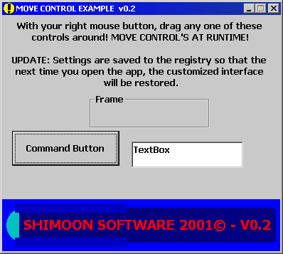 An update to my code on how to move controls at runtime. With version 0.2, the program saves all the settings to the registry, so that the next time a user opens the application, the settings will be restored.