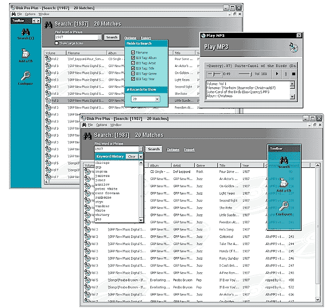 **** UPDATED to include an on-board MP3 Player! Now you simply double-click on the song in the search window, and Disk Pro will prompt you to insert the proper CD, and then play the song! **** Disk Pro is an MP3 Indexing program. If you have lots of CD's that contain MP3 files, and you need a quick way to see what CD has what song, this program is a great start! It allows you to rapidly index CD's (insert one by one), storing all file and volume information, ID tag info, and misc info like bit rate, length, etc, into a data file. You can then easily perform searches on one or more fields to locate the song(s) at a later time. I also added some extra GUI features, such as a translucent, detachable, dockable toolbar, html template reports, sortable listview, configuration page, and 99% persistent interface (it remembers everything so next time you start app, it will be the way you left it). Keywords used for searches are also maintained. The Export-To-HTML uses template files, so you can easily modify the files to format the output the way you choose. Again, with the update, you can now also PLAY the MP3 files right from within Disk Pro. It should be a good start for a great indexing program. If you like it, votes are always appreciated.
