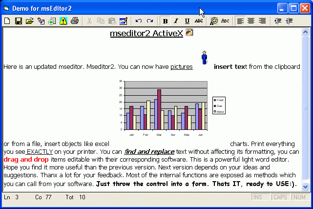 Here is mseditor2 greatly updated from mseditor1. I received many emails with a lot of ideas as to what to add to the control. This is the new version. Now you can print WYSIWYG, insert pictures, files and OBJECTS (Like msword Charts, excel, ANYTHING). You can find and replace text without affecting its formatting. There is a status line with current line, column total lines etc. I did remove the databound properties but this is only a couple of lines of code anyway. You can always implement this outside the control. If there is interest I will add more features. The whole idea is the same. Just THROW the control into a form and USE IT. In the examples in the screenshots below there is absolutely no code in the form, JUST the control. It is fully parametric with a lot of exposed ‘methods’ which you can call from your program. There is a technique for a form to call back on the control (in the find replace form). This might be educating to novice programmers. If you don’t want almost instant status refresh then remove the timer and its code. The status gets informed when you change something or click the mouse somewhere. It’s a lean mean word editor and with your help it gets better all the time. Thanks for your feedback, both online and into my mail box.