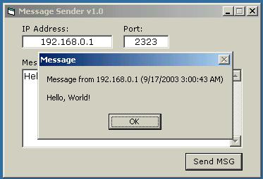 This a simple Message Sender, I wrote this coz my friend need this kind of program. Very simple and basic, fully commented so its easy to understand. If you find any bugs please report or if you have some questions, suggestions or comments, please email me. The concept of this program is to avoid permanent connections, so if the client send a message, the host get it and disconnect the client immediately. If you may find this usefull, then thanx... good luck to you all and God Bless.