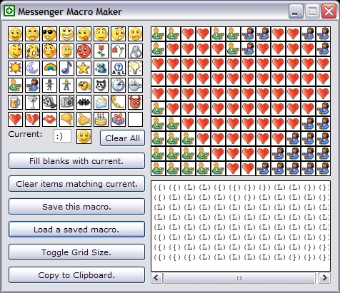 Simple program in nature. This program will allow you to build emoticon picture macros. I am sure many of you have seen them when chatting. It is when a person uses a bunch of emoticons to build a bigger picture. Like the word "Hello" spelled out with smile faces. Take a look at the screen shot for a clearer understanding. Anyhow, this is my third post of this (I have removed the other posts of it to help clean VBC clean from older versions of the same software [wish others would do the same sometimes but I am getting off on a tangent]). The latest update now gives you a WYSIWYG (what you see is what you get) feel. A person asked form that in my last post. This version will still read the older macro files the other versions generated if you did find yourself using my last version. Next step (if I find the time) is to make it a real MSN Messenger Add-In. Hope you all like it.