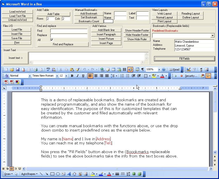 I always wanted to 'imprison' microsoft word and this is the execution of the sentense. I wanted word to reside inside an activex control and not run by itself. I also wanted full control of it and also use it as a report generator. Of cource you must have microsoft word 2000+ on your computer (Sorry for that, but we are going to IMPRISON it so feel a bit better). I have only tested this with word 2003 and I would like your feedback. First loading can be slow (Microsoft!!). This is the VERY first version (pre-alpha) and any comments will be highly appreciated. Forgive my dirty programming demo program but this is the work of a single day and I put effort on the control and not the demo. The concept is for word to live inside the Webbrowser control. You can create named bookmarks and replace them with values at runtime. This is the backbone for custom reports (or templates like reminding letters etc). You can insert pictures, files etc at will anywhere. You can toggle various things on-off. You can print, load and save documents in various formats (see code for 'Save File'). Click on the 'Load Test file' to test the predefined bookmarks. Also there is a technique to load files from the resource file (see code in the control). Well I hope that somebody out there wanted something like this. I wil keep on improving it as I need it in one of my projects (Radiologist reports with IC10 codes etc) but thought that I get some feedback from you while at it. If you care to vote then please leave a message as some sort of feedback that will help me in this project. Have fun and enjoy VB = Very Beautyful :)