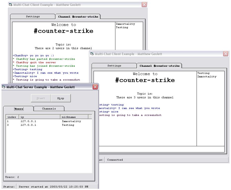 A server and a client application. Using the winsock array, it's a wonderful example of how to create multiple winsock sockets and a public chat room. The server supports content filtering, blocking all swear words in chat messages, multiple chat channels and actions. Important lines are commented so you will be able to learn from my program. This is an excellent code structure for any socket application and it is incredibly easy to understand.