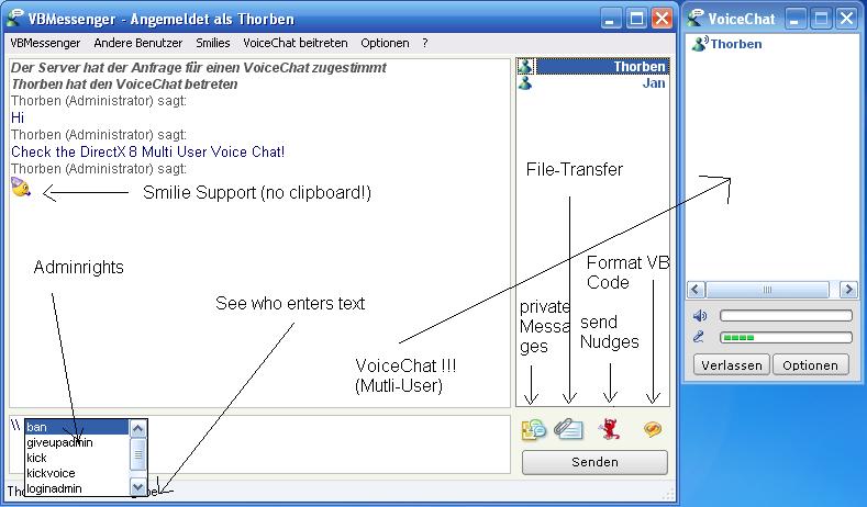 This is a multiUser-Chat with Voice, Filetransfer, private Messages, Nudges, Vb-Function, send little Pictures, fonts, Adminrights....