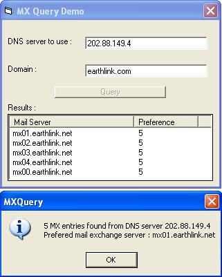 4. There was a bug in Jason's code due to which if the DNS response was compressed it would return only the first MX record. For example, Jason's code would return one MX record for earthlink.com while mine will return all five.