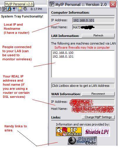 MyIP Personal is a pretty small application I created for helping my friends play online games (internet and LAN). Features include: Your REAL IP and Hostname, Detects all computers connected via LAN (helpful to make sure everyone had a successful connection) and resides in the system tray. As an added bonus it has a quick link to scan your ports for weaknesses and exploits.