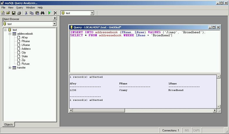 myAnalyzer is a simple query analyzer that allows users to run SQL Statements to their mySQL database. This program does not use ADO but rather connects directly to mySQL through the DLL file included with mySQL (this through the help of some code borrowed from an individual mentioned inside the code). myAnalyzer also allows the user to save the sql query as well as print the query or it's results. The program has full search capabilities and can run multiple queries in one window or multiple queries through several databases in an MDI environment. I hope this benefits others out there as I wrote it to help me debug my SQL queries for my apps. You can connect to your mySQL server through a logon screen, or pass the information through to the exe from another application or command line.