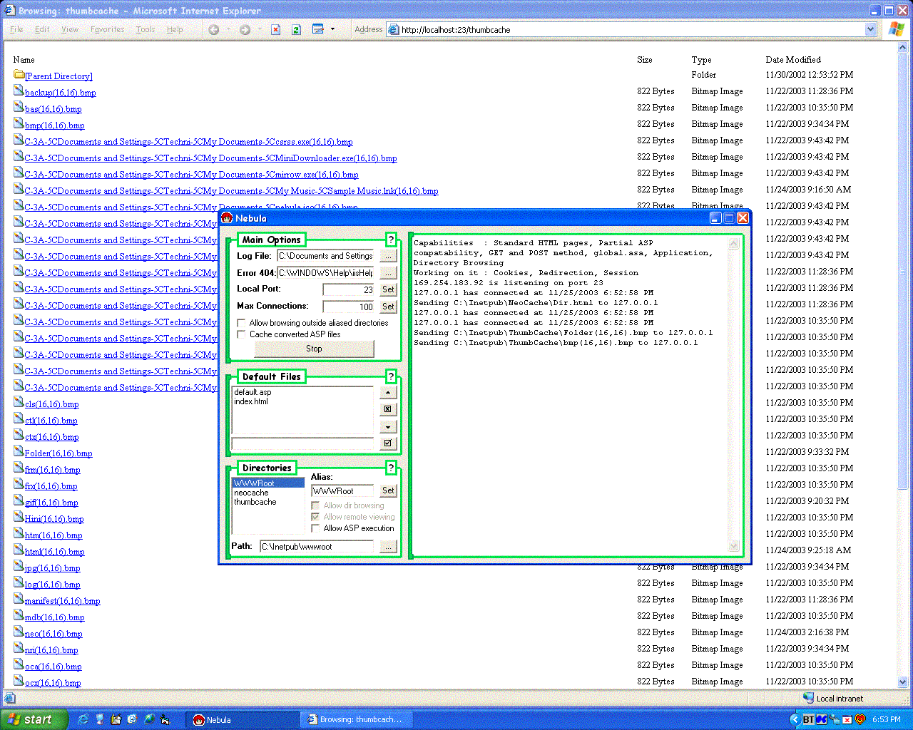 Acts as an ASP web server similar to IIS where you can alias multiple directories. Certain things are incomplete (Like locking out remote viewers) but will be added later. Just wanted to get some bug reports/help