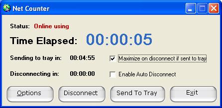 This is a Net time counter. When run, it logs relevant details about the connection (such as start time, time elapsed...) in a log in a folder you choose (Default: My Documents) when an established internet connection is severed. Includes an auto-disconnect feature whose time can be configured. When program is sent to tray, right-clicking on it's icon will display the elapsed time as well as offer options such as disconnect, maximize... Log generated can be exported to Excel spreadsheet for calculations and analysis.